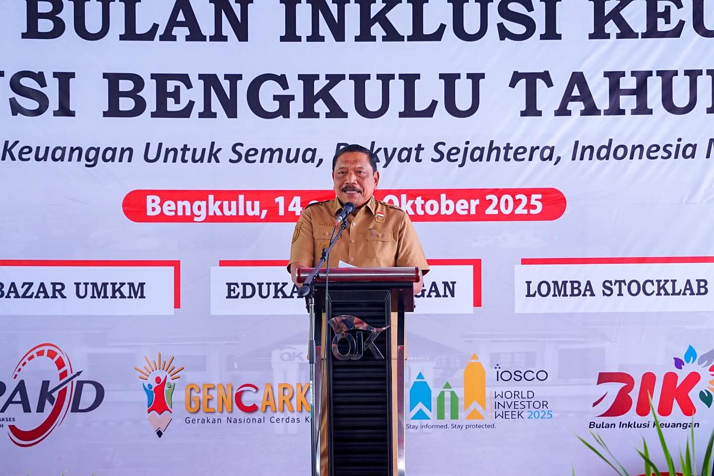 Wagub Mian saat menyampaikan pidato sekaligus menghadiri kegiatan Bulan Puncak Inklusi Keuangan 2025 yang digelar di Kantor Otoritas Jasa Keuangan (OJK) Provinsi Bengkulu, Selasa (14/10) pagi. (Foto: Eko/nuansabengkulu.com)