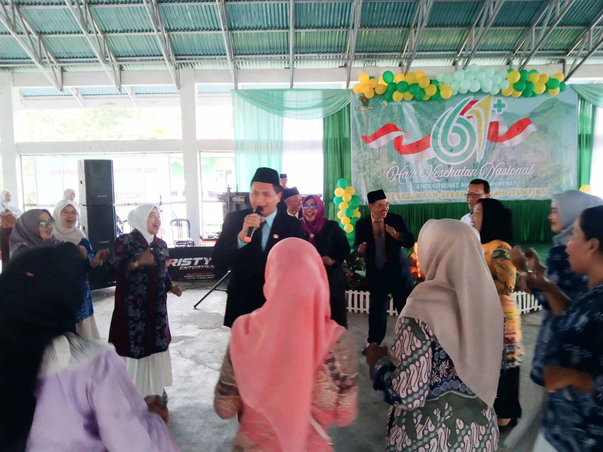 Suasana acara berlangsung meriah dan penuh keakraban. Salah satu momen menarik terjadi ketika Kepala Dinas Kesehatan Rejang Lebong, Asep Setia Budiman, tampil menghibur dengan membawakan lagu berjudul “Aku Rindu.” Aksi spontan tersebut disambut antusias oleh seluruh pegawai Dinkes yang ikut berjoget bersama, menciptakan suasana ceria di tengah kegiatan peringatan HKN (jk).