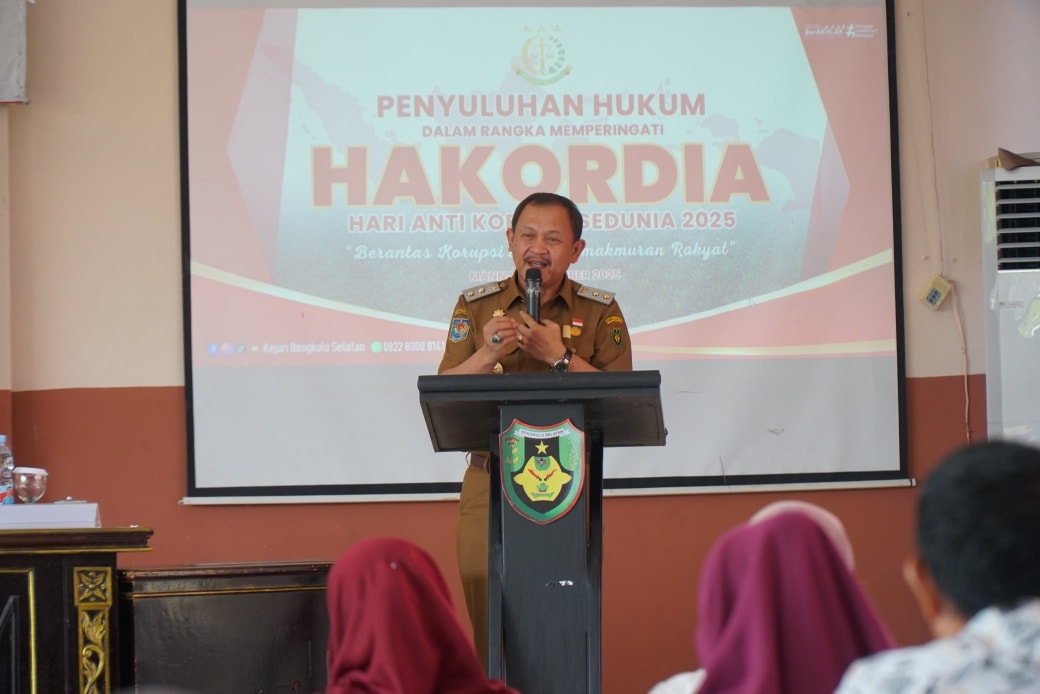 Wakil Bupati, Yevri Sudianto menghadiri kegiatan Penyuluhan Hukum terkait Koperasi Merah Putih dalam rangka Peringatan Hari Anti Korupsi Sedunia di Aula Bappeda-Litbang Bengkulu Selatan, Selasa (09/12/25).
