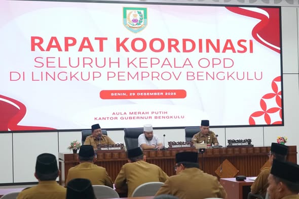 Gubernur Bengkulu Helmi Hasan mengapresiasi kinerja seluruh Organisasi Perangkat Daerah (OPD) Pemerintah Provinsi Bengkulu dalam rapat koordinasi dan evaluasi program tahun 2025 yang digelar di Aula Merah Putih, Senin (29/12).