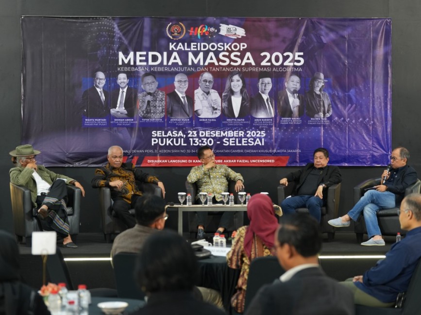 Isu tersebut mengemuka dalam dialog Kaleidoskop Media Massa 2025 bertema Kebebasan, Keberlanjutan, dan Tantangan Supremasi Algoritma yang digelar Persatuan Wartawan Indonesia (PWI) dan ditayangkan melalui podcast Akbar Faizal Uncensored di Hall Dewan Pers, Jakarta, Selasa (23/12/2025).